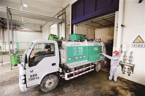 工作人员正在把餐厨垃圾倒入餐厨垃圾接料仓。